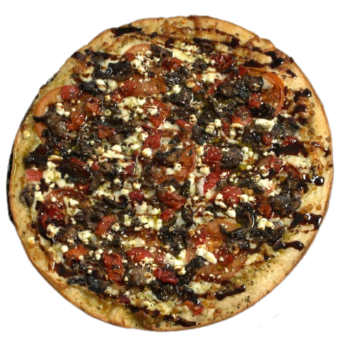 Pesto, mozzarella, sliced tomatoes, sautéed mushrooms, roasted red peppers, goat cheese, balsamic reduction & herbs.