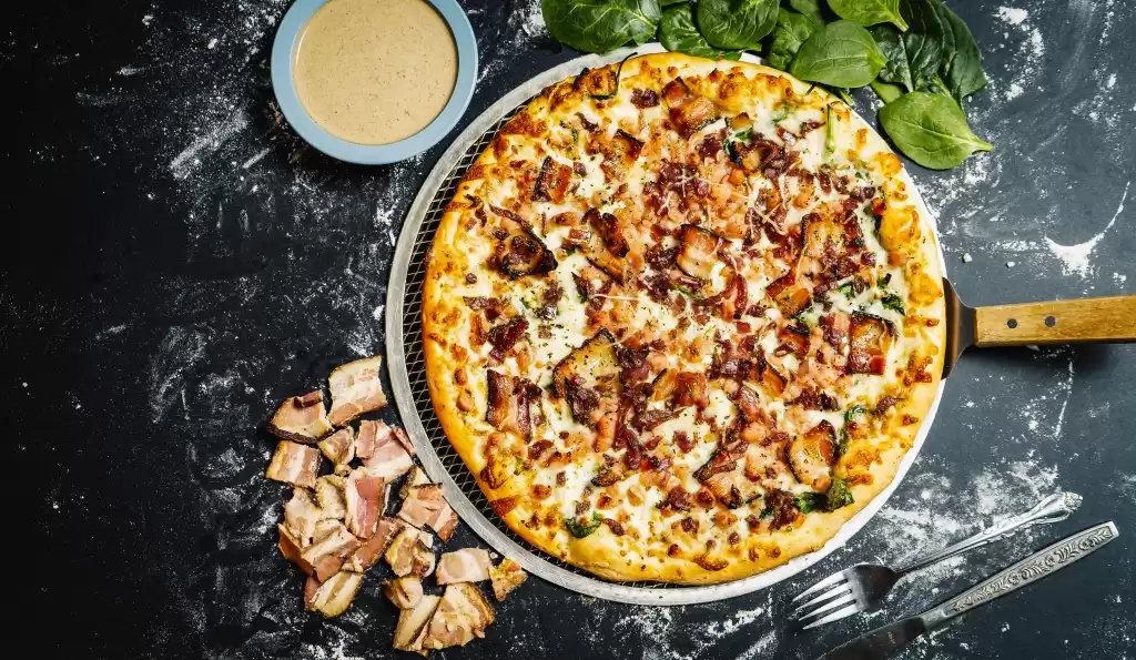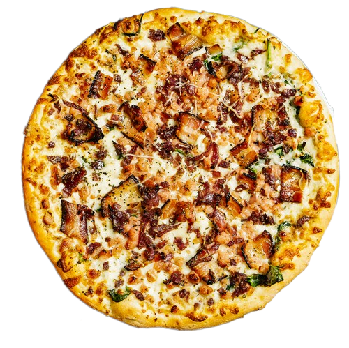 White sauce, spinach, mozzarella, smoked bacon, crumbled bacon, caramelized onions, and herbs.