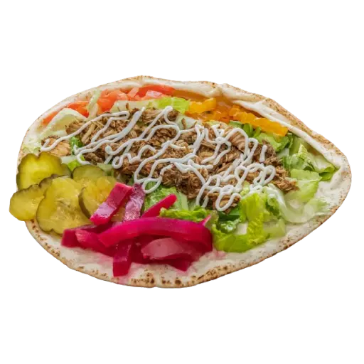 Marinated chicken breast, tomato, lettuce, pickle, pickled turnip, hot pepper & garlic sauce (On 9″ pita bread).