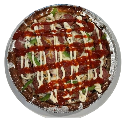 Fries, mixed jambon, mushroom, green pepper, Persian sausage, mozzarella, ketchup, and mayo.