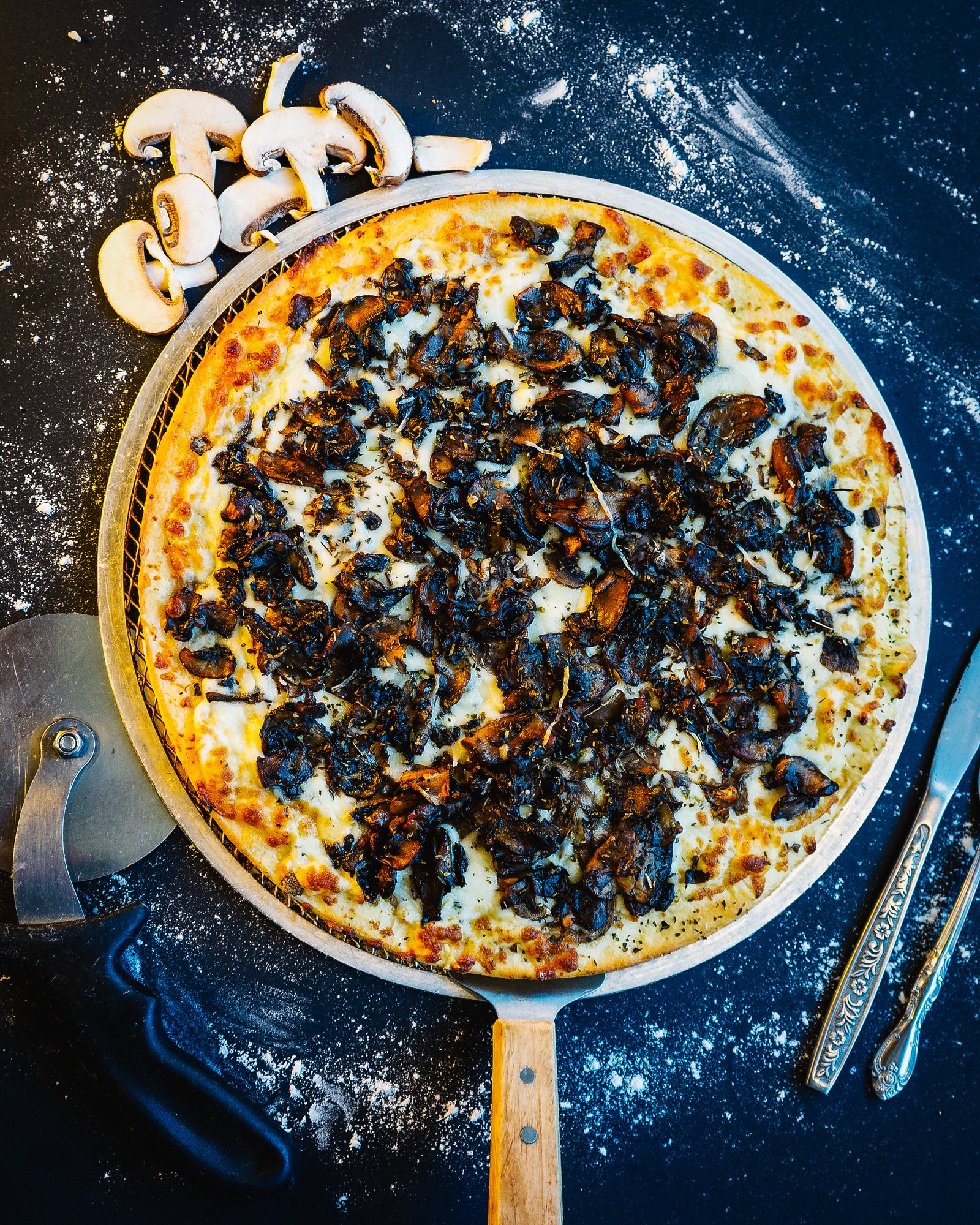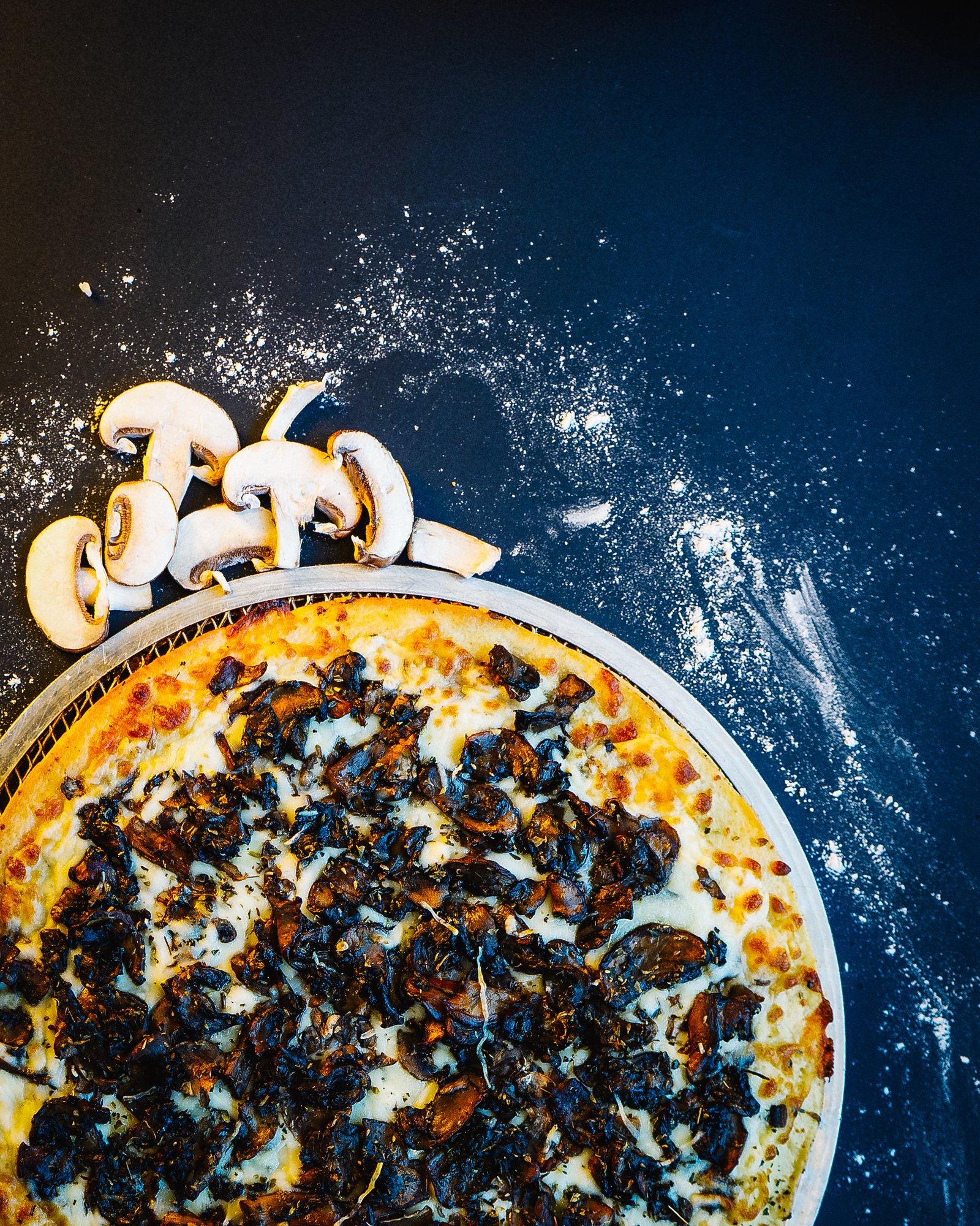Light garlic sauce, mozzarella, sautéed mix of mushrooms, Parmigianino, asiago, herbs & fresh garlic.