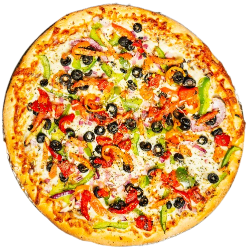 Neapolitan pizza sauce, mushrooms, onions, green peppers, black olives, hot peppers, roasted red peppers, ginger & garlic, garnished with cilantro & tomato.