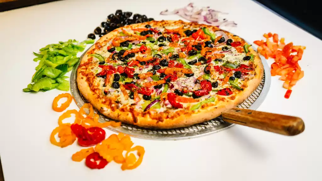 Neapolitan pizza sauce, mushrooms, onions, green peppers, black olives, hot peppers, roasted red peppers, ginger & garlic, garnished with cilantro & tomato.