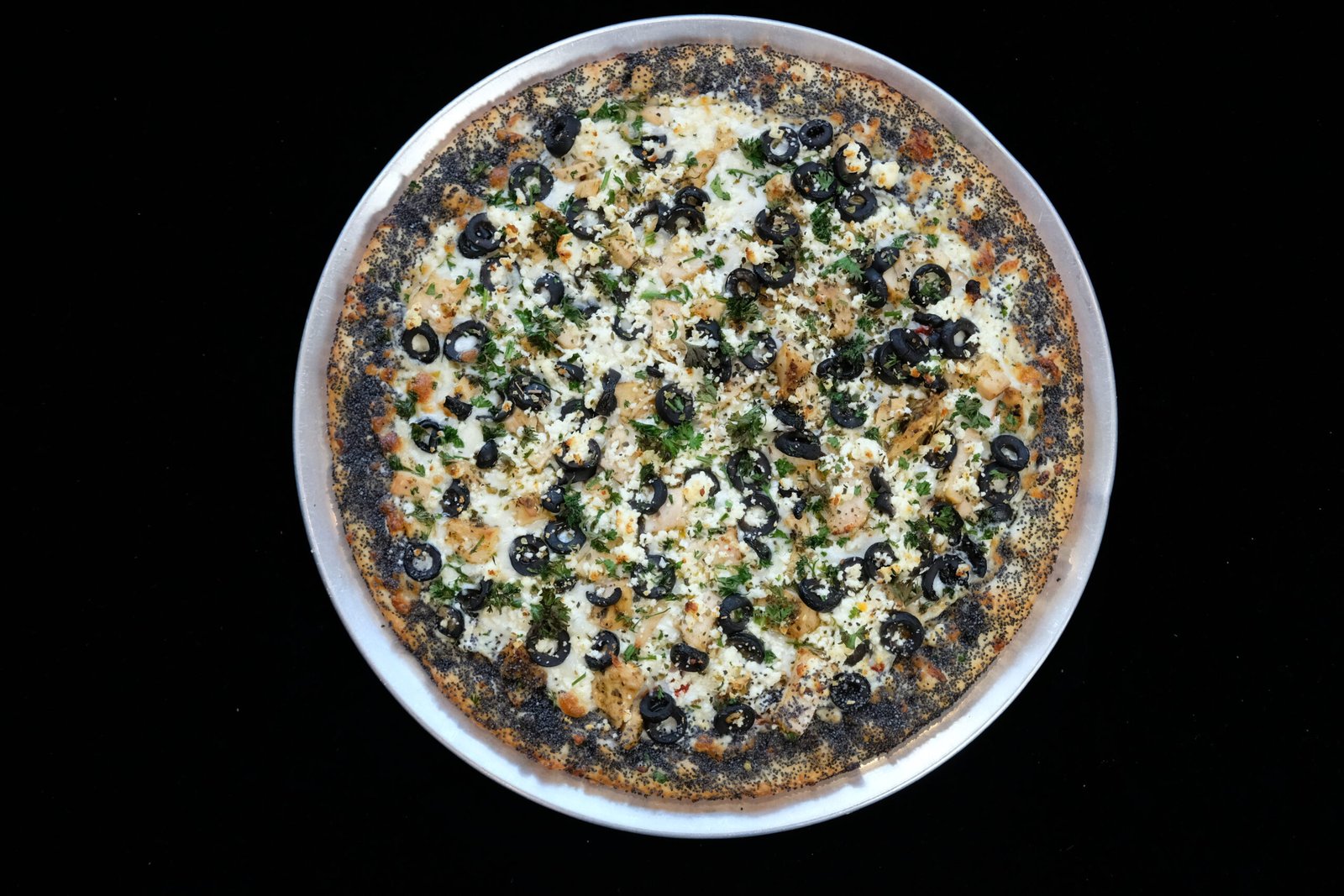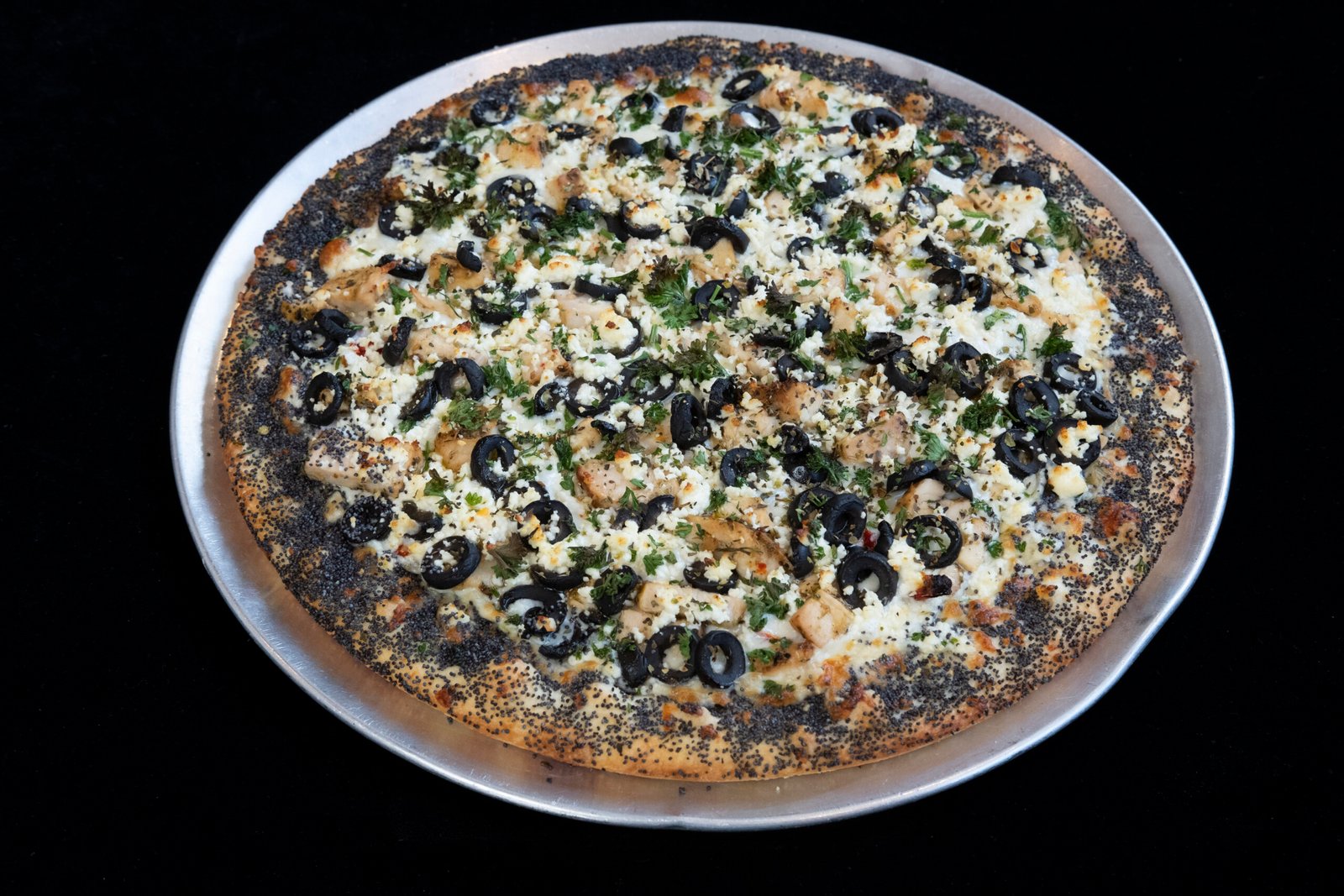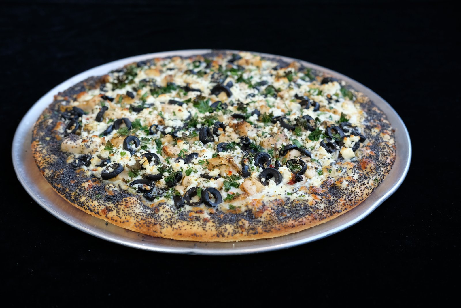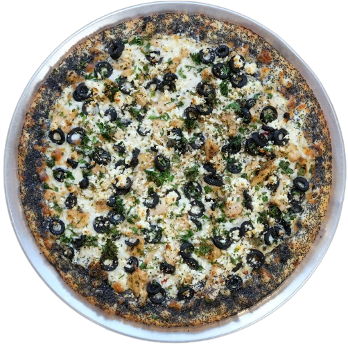 Edged with poppy seeds, olive oil, mozzarella, sun dried tomatoes, chicken, black olives, feta, parsley, herbs & garlic.