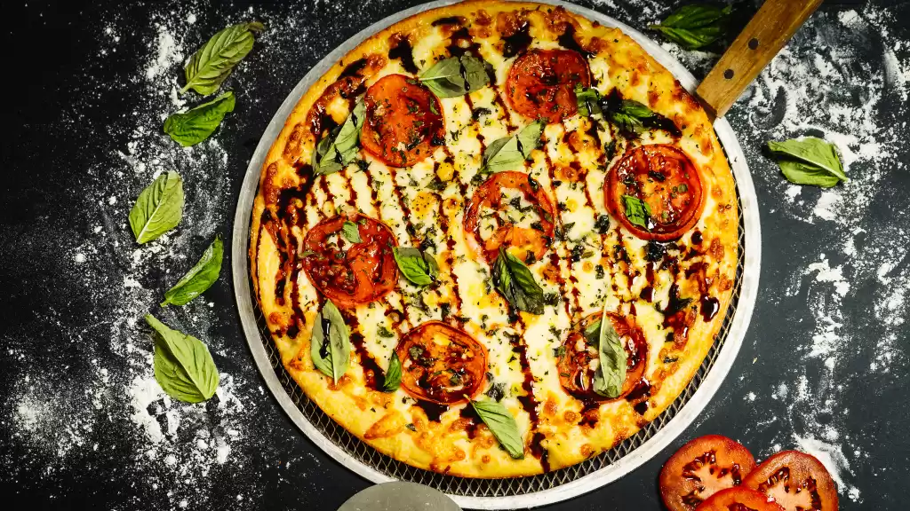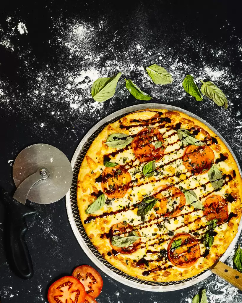 Olive oil, mozzarella, fior di latte, sliced tomatoes, fresh basil & balsamic reduction.