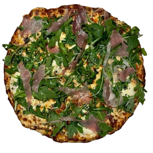 Neapolitan sauce, mozzarella, fior di latte, basil, Parmesan, garlic-infused olive oil, finished with arugula and prosciutto, after it’s cooked.