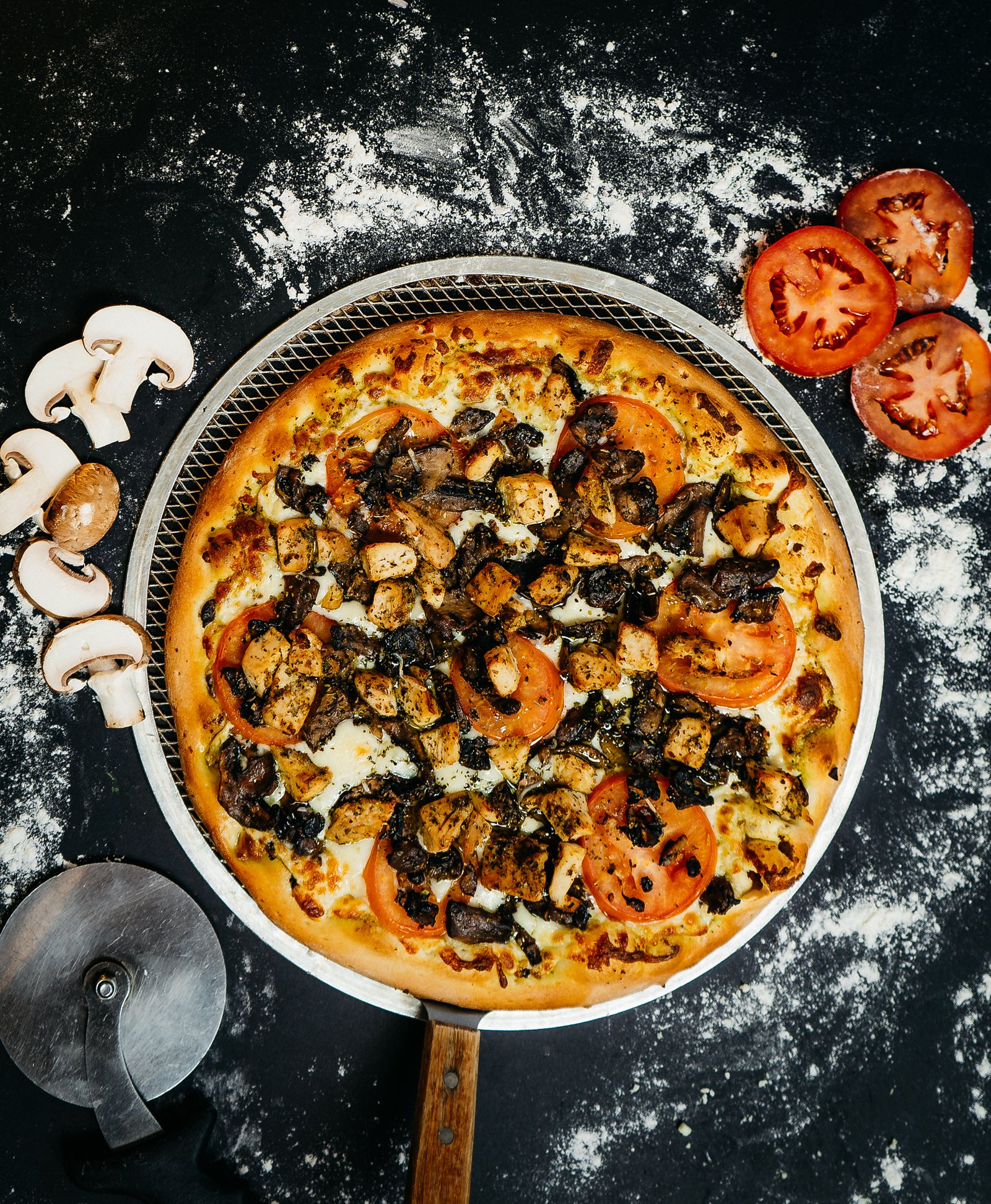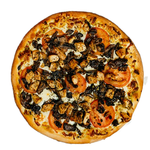 Pesto sauce, mozzarella, sliced tomatoes, chicken breast, sautéed mushroom, herbs, Parmesan & garlic infused extra virgin olive oil.