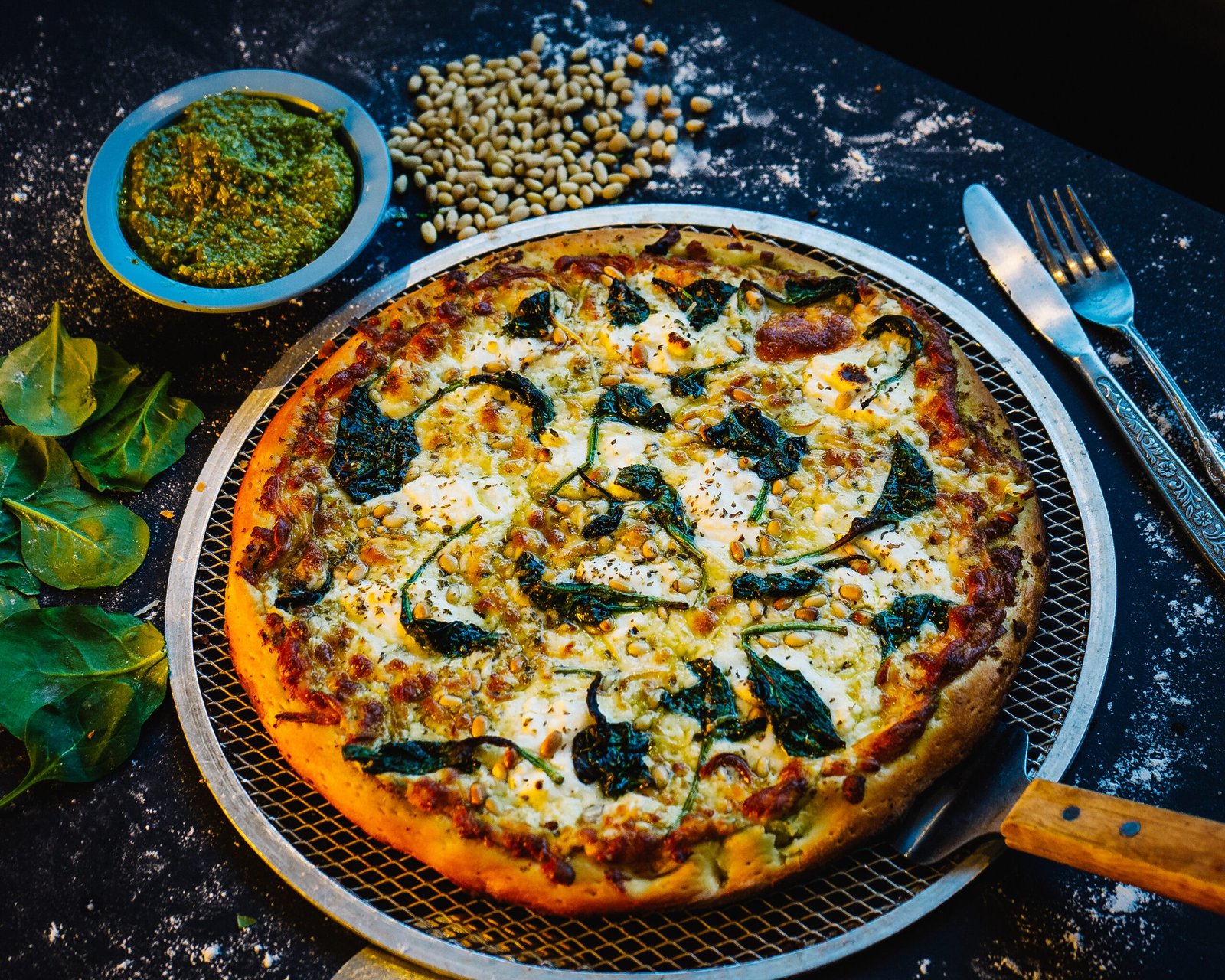 Pesto sauce, mozzarella, sautéed spinach, fresh garlic, Parmigianino, pine nuts, basil & ricotta.