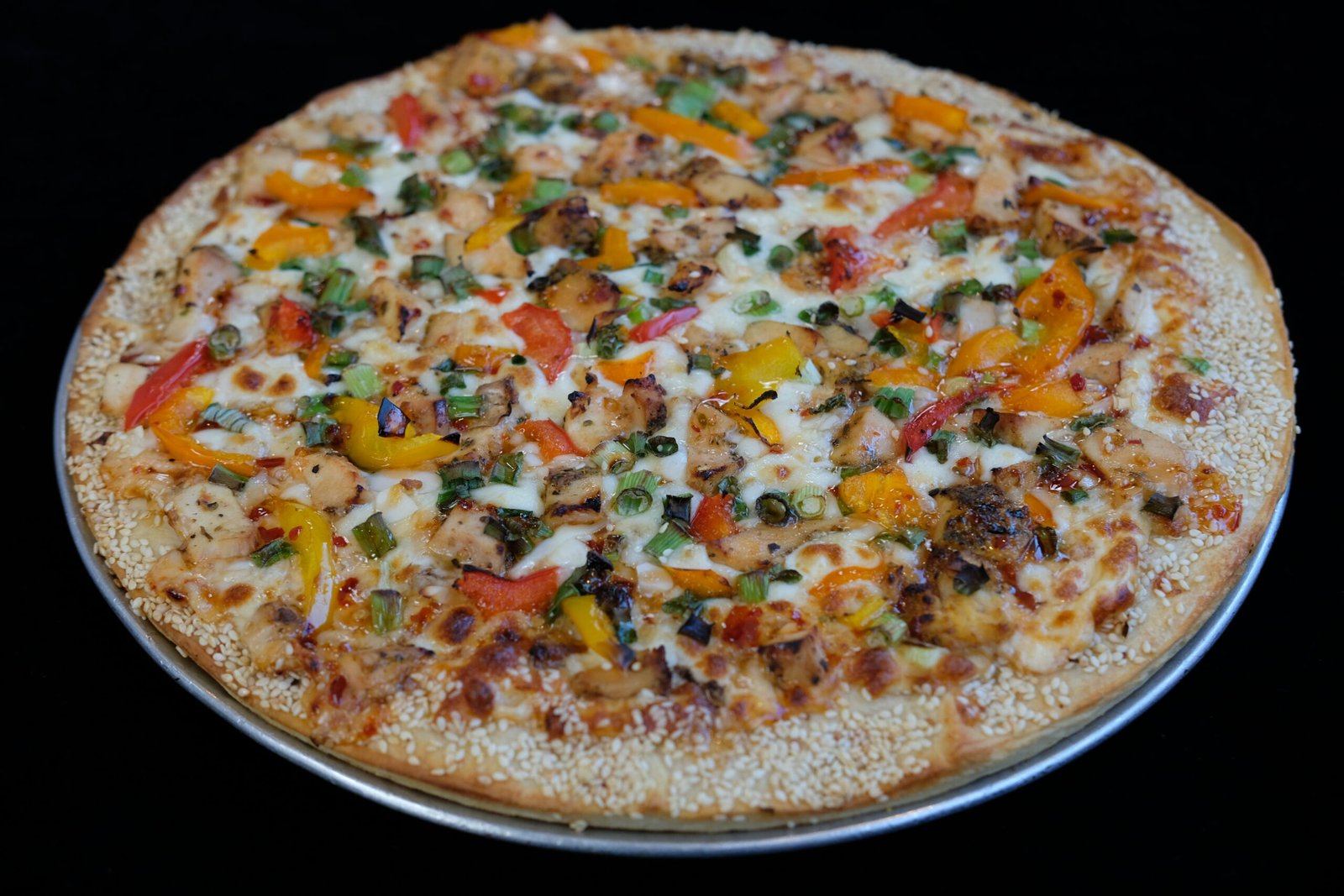Sesame crust, Thai sauce, mozzarella, mushroom, chicken breast, green onions, bell peppers, almonds & Parmesan.