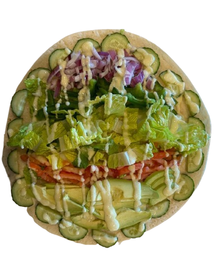 Avocado, green pepper, lettuce, tomatoes, cucumbers, red onions, & our homemade aio. Grilled On 12″ Tortilla